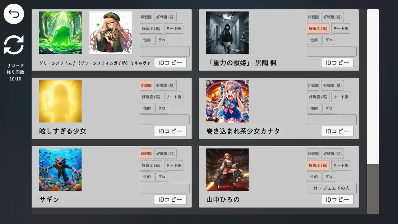 ゲーム『エターナルハンド』は、文章生成AI × 画像生成AIを掛け合わせた全く新しい体験をお届けします。対戦画面ではまるで小説のようにストーリーが執筆され、場面に合わせた挿絵が生成されるのが特徴です。 |