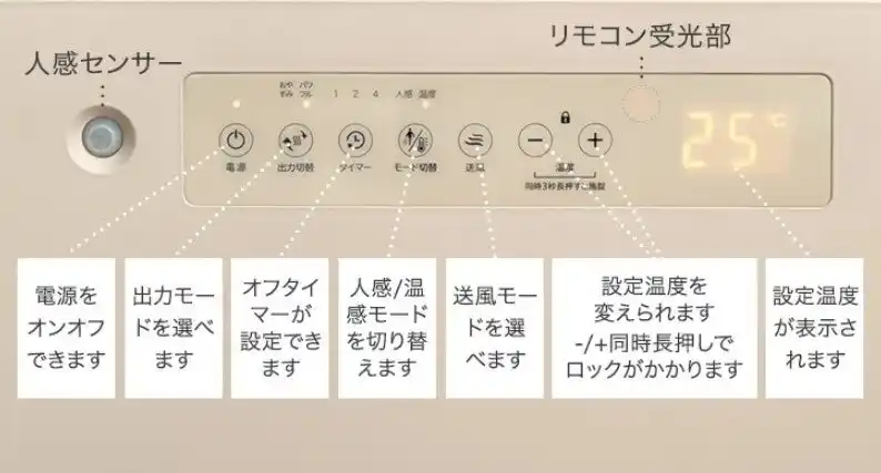 本製品は、人感センサーと室温センサーの2つを搭載しております。人感センサーは人の動きを感知し、自動で運転のON/OFFを切り替えることにより、消し忘れ防止になり、また効率的に暖まることが可能です。 |