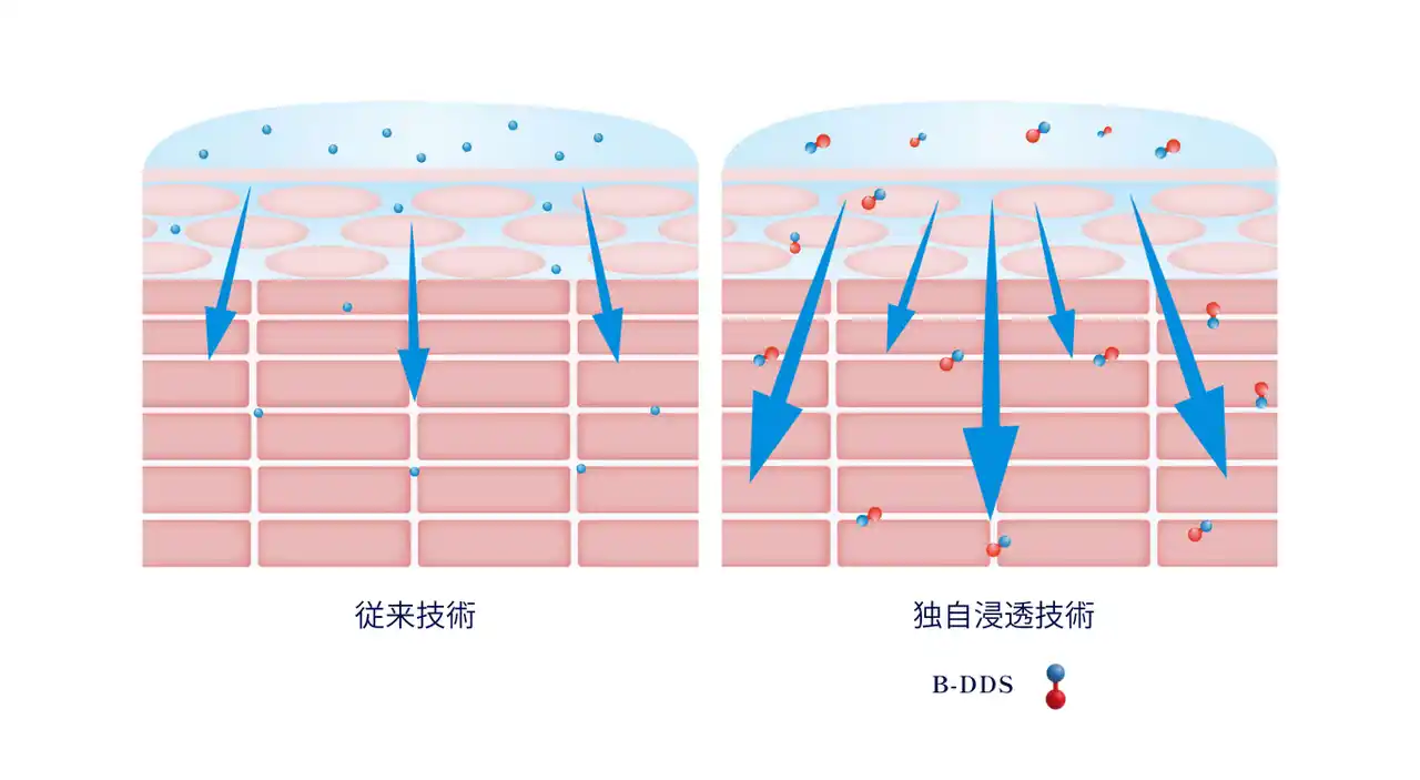 本来、肌の角層は親油性のため水溶性有用成分は浸透しにくいが、水溶性有用成分を含む「B-DDS」がバリア機能として働く液晶構造と近い性質になり角層への浸透をサポートする。 |