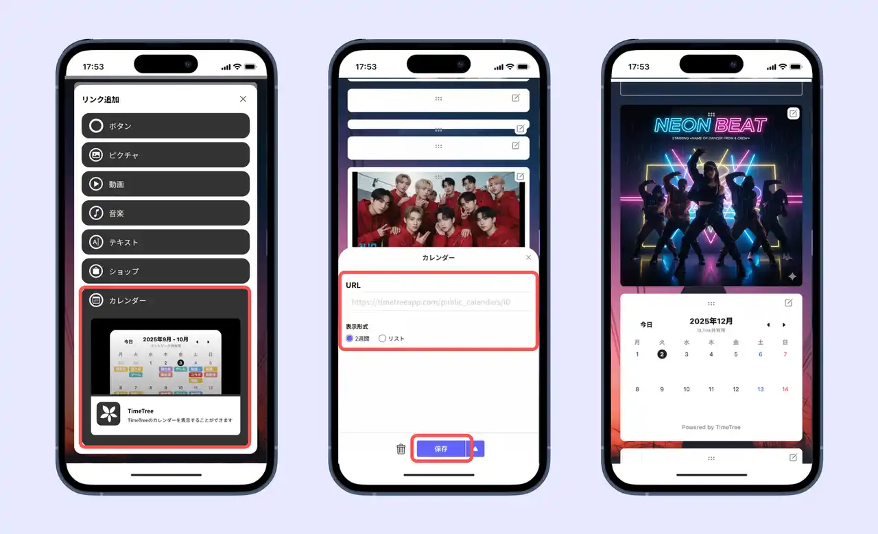 これにより、ユーザーはTimeTreeで作成した「公開カレンダー」を自身のlit.linkページ内に直接埋め込み、イベント情報や出演スケジュールを手軽に発信できるようになりました。 |