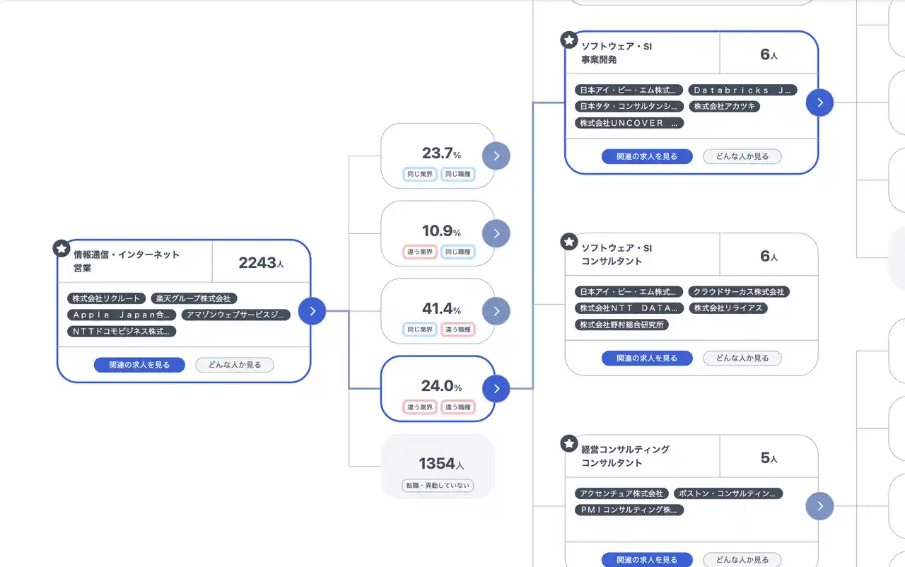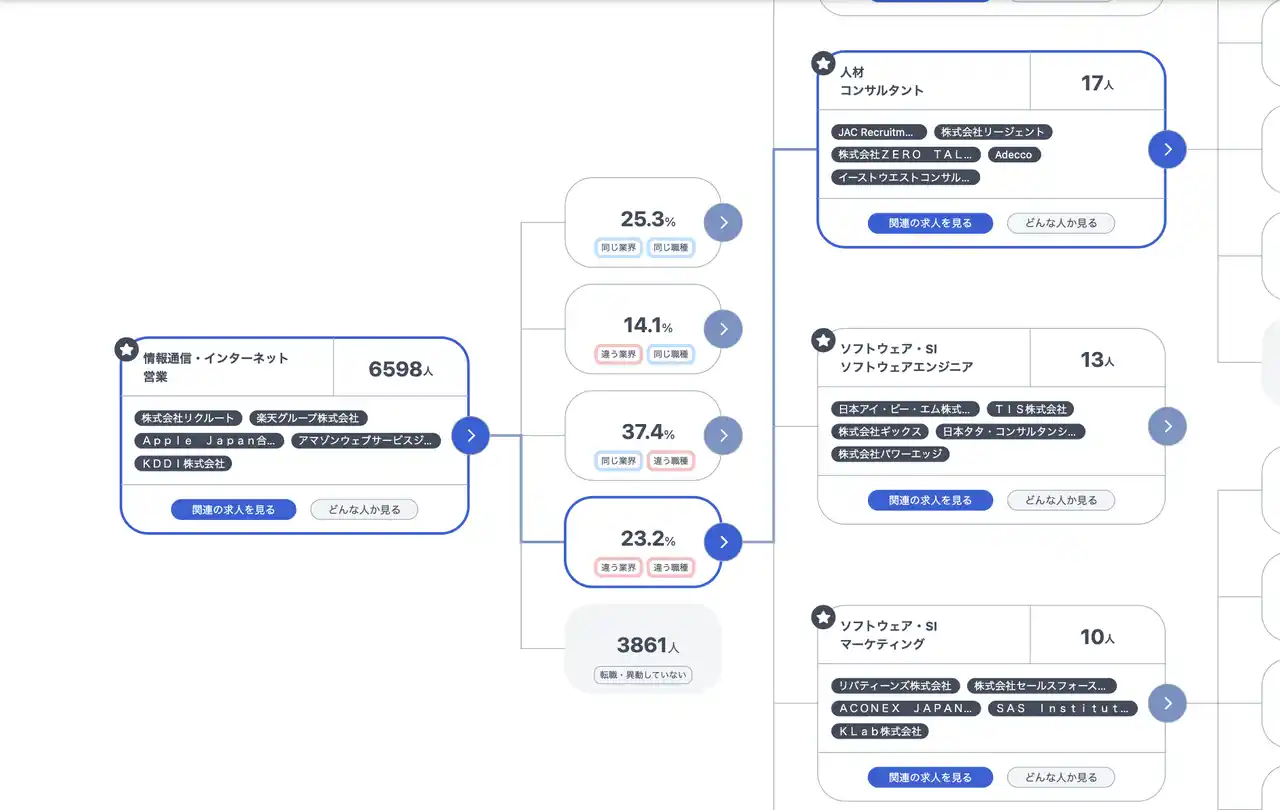 本機能は将来予測ではなく、過去の大規模実績データから導いた「実際にどのようなキャリア遷移が発生しているか」を地図形式で表示します。 |