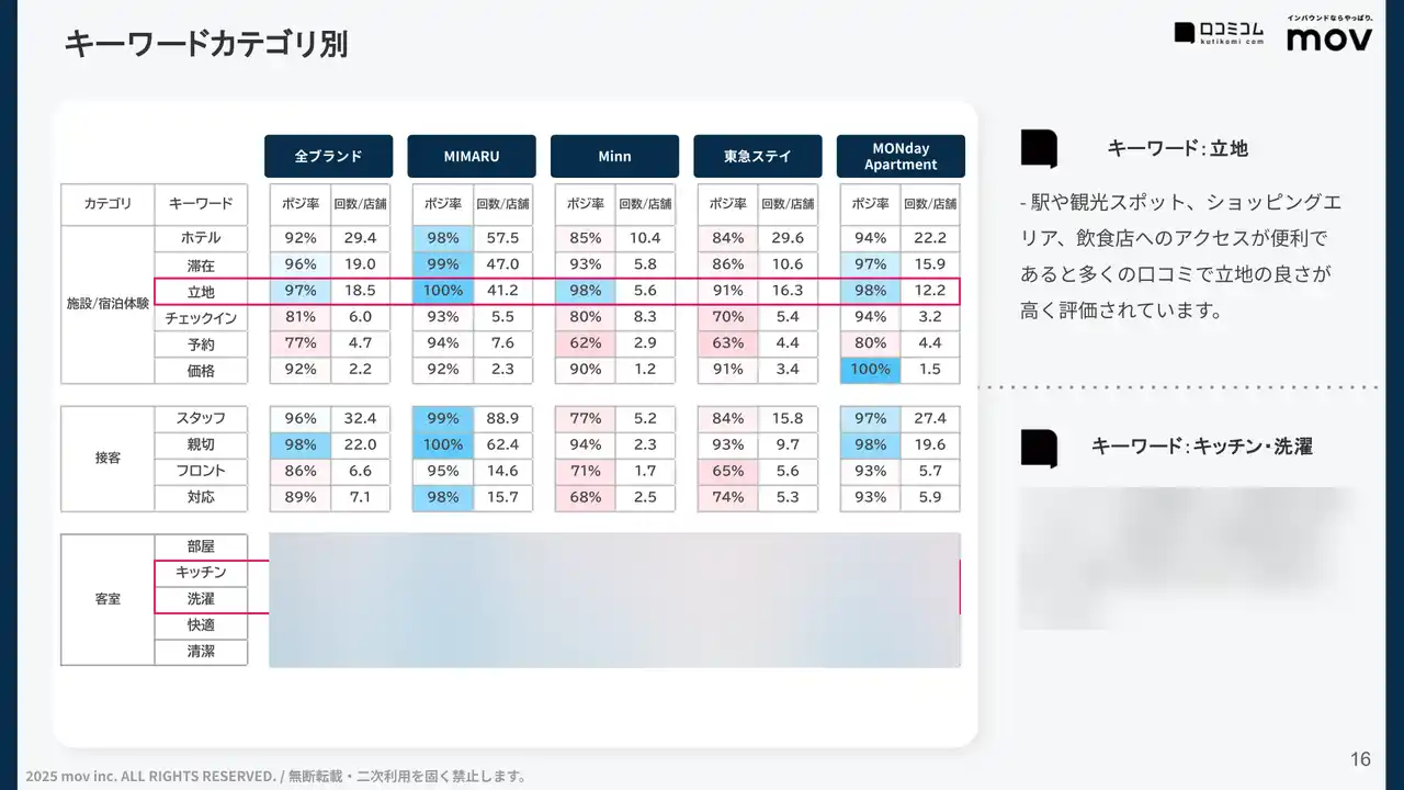 各ブランドでは「立地」「キッチン」「洗濯」に関する口コミが多く見られました。 |
