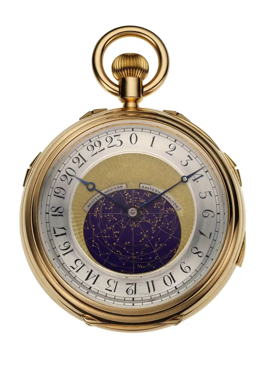 18Kイエローゴールドケースの“グロス ピエス”は、オーデマ ピゲが製作した中で最も包括的な天文時計であり、スカイチャートを搭載した初期の作品のひとつです。ロンドンの夜空を315個の星とともに描き、恒星時、永久カレンダー、ムーンフェイズ、均時差を表示します。20世紀に製作されたオーデマ ピゲ唯一の超複雑懐中時計であり、ミニッツリピーター、グランド&プチソヌリ、クロノグラフ、そしてAPの懐中時計では当時唯一のトゥールビヨンを備えています。 |