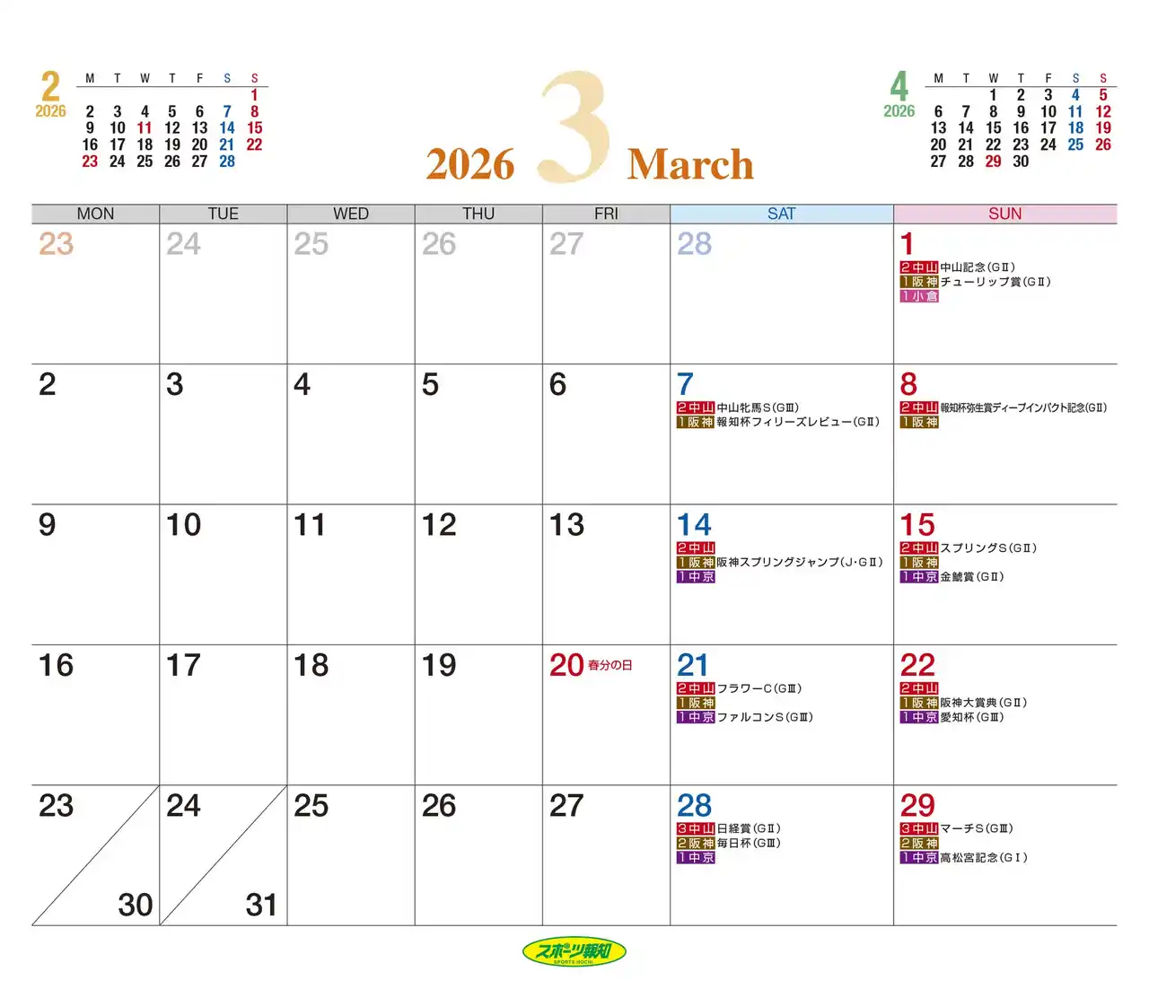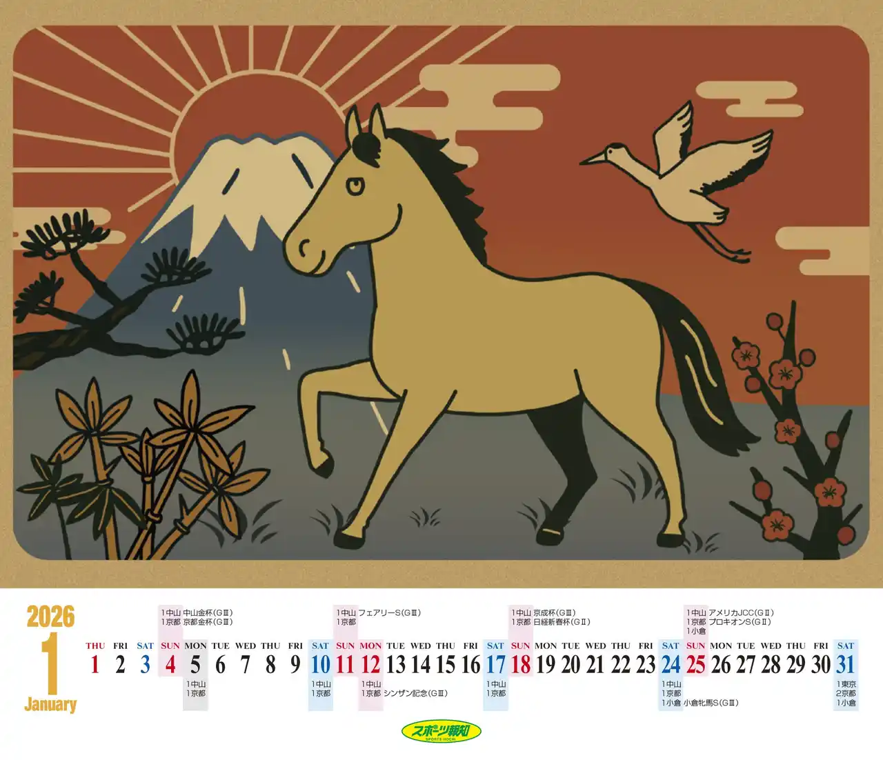 「スポーツ報知」を発行する報知新聞社(代表取締役社長・長谷川剛)は、全国の競馬ファンを魅了する馬のイラストレーター・おがわじゅりさんが描いた、実在馬と架空馬を組み合わせたイラストカレンダーの販売を始めました。色彩も鮮やかで、季節にマッチした可愛らしい表情や、躍動感あふれる競走馬や架空馬が卓上判に収まっています。さらに2026年のJRA開催日程(レーシングカレンダー)がイラスト面、カレンダー面の両方に掲載されている実用性抜群なカレンダーとなっています。 |