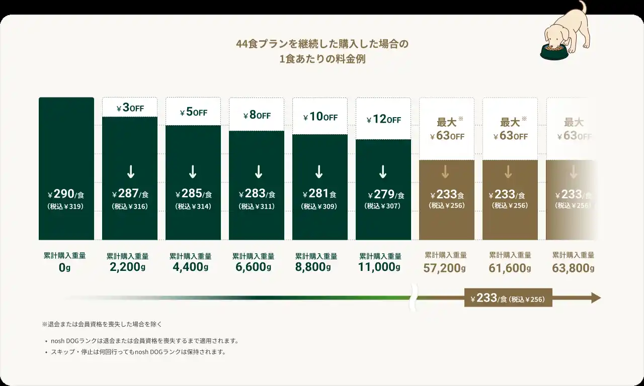 「nosh DOG club」は、累計購入重量に応じてランクが上がり、割引率が段階的に上昇する制度です。100gプランの場合、最大で63円OFF、最安256円(税込)(※)でご購入いただくことができます。また、一度達成したランクは、nosh DOGをご利用いただいている限り継続して適用されます。 |