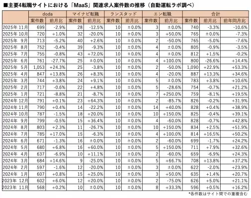 「MaaS」の関連求人案件数(主要転職4サイト)は2025年11月末時点で、前月比3.3%減、前年同月比10.6%減の740件となりました。