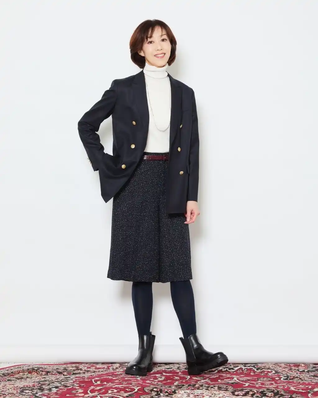 | タートル×ツイードキュロットの上品な組み合わせ。端正なネイビーのダブルブレザーが、クラシックな着こなしをより知的に仕上げます。 | |||