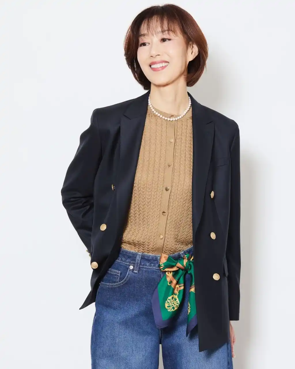 | デニムにブレザーを合わせた、大人カジュアルの王道。スカーフのアクセントが、シンプルな装いをモダンに引き上げます。 | |||
