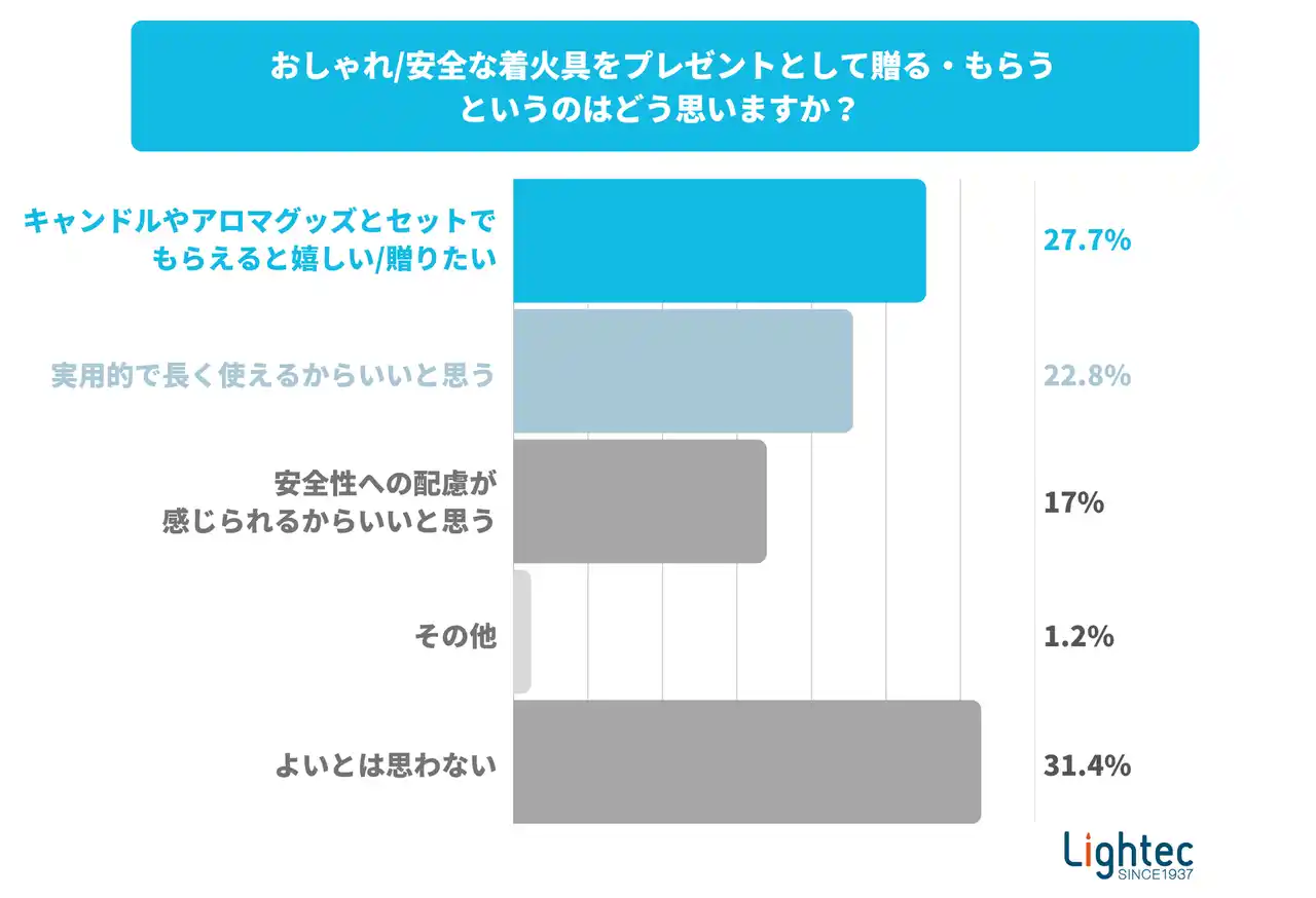 最後に、おしゃれな着火具をプレゼントとして贈る・もらう、というのはどう思うか尋ねました。ここでは「キャンドルやアロマグッズとセットでもらえると嬉しい/贈りたい(27.7%)」という回答があり、着火具がギフトとして魅力的な商品になりうる可能性も示されました。 |