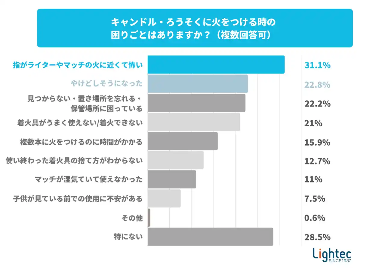 続いてのキャンドル・ろうそくに火をつける時の「困りごと」や「気になること」において、回答者の約3人に1人(31.1%)が「指がライターやマッチの火に近くて怖い」、が「やけどしそうになった(22.8%)」と回答しました。これらの経験は、短い炎の使いきりライターをキャンドル点火に使用する際に生じやすいリスクを示しており、より安全な着火具の必要性を裏付ける結果となっています。 |