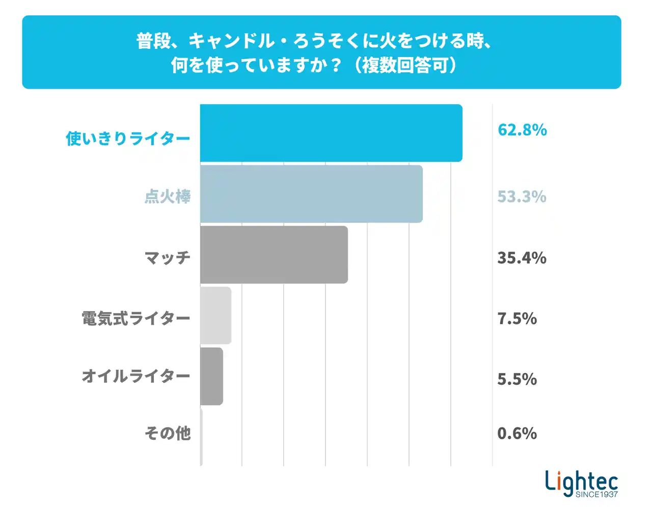 ライテックはライターメーカーとして、かねてより火を扱う製品の安全性向上と、お客様への正しい使用方法の啓発に努めてまいりました。今回は、一般消費者の皆さまが安全に火を扱えるよう、全国の20代~60代の男女を対象に「火」の安全意識や着火具の利用実態についてインターネット調査を実施しました。 |