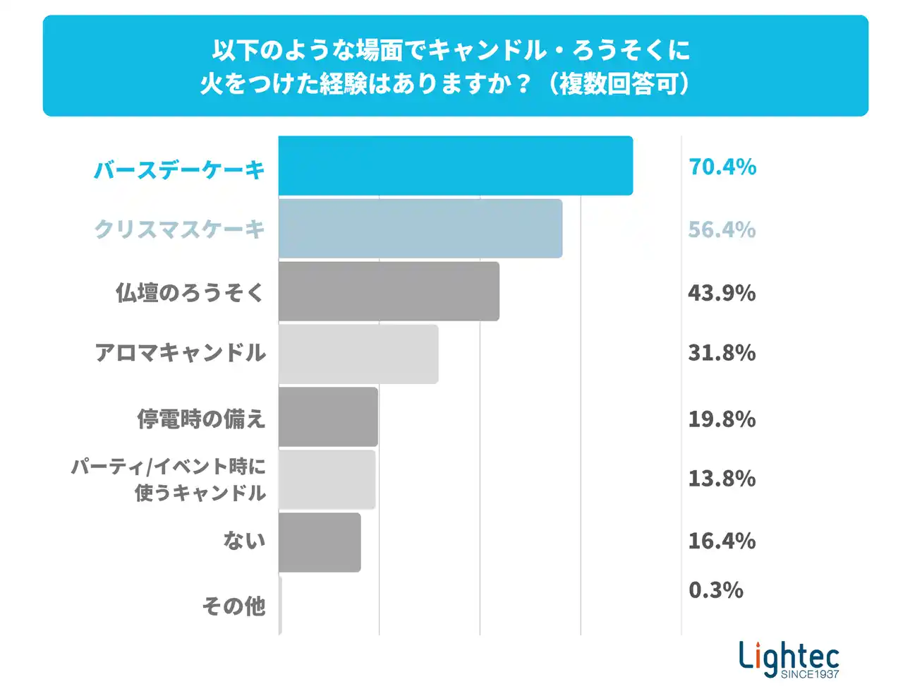最初に、どのような場面でキャンドル・ろうそくに火をつけた経験があるか尋ねました。すると、「バースデーケーキ(70.4%)」や「クリスマスケーキ(56.4%)」といったイベントでの利用が上位を占め、ホリデーシーズンに火を灯す機会が非常に多いことが読み取れました。 |