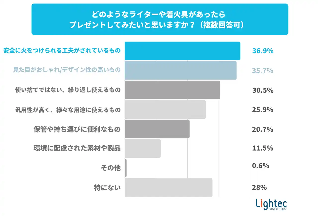 次に、どのようなライターや着火具であれば、プレゼントとして贈ってみたいと思うか尋ねてみました。ここでは、「安全に火をつけられる工夫がされているもの(36.9%)」が最も高く、次いで「見た目がおしゃれ/デザイン性の高いもの(35.7%)」、「使い捨てではない、繰り返し使えるもの(充電式、詰め替え式など)(30.5%)」が上位にランクインしました。消費者が着火具に対し、従来の機能性だけでなく、安全性、デザイン性、そしてサステナビリティといった付加価値も重視していることが明らかになっています。 |