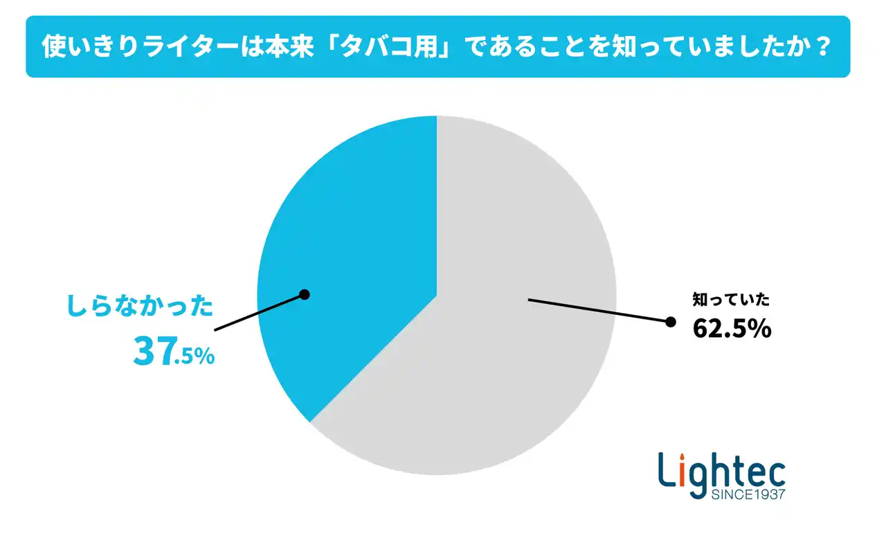 そこで、使いきりライターが、本来「タバコの点火用」として認識されていることを知っていたか尋ねたところ、約3人に1人(37.5%)が「知らなかった」と回答。多くの人が、使いきりライターの本来の用途や、キャンドル点火時のリスクについて十分に認識していない可能性が読み取れます。 |