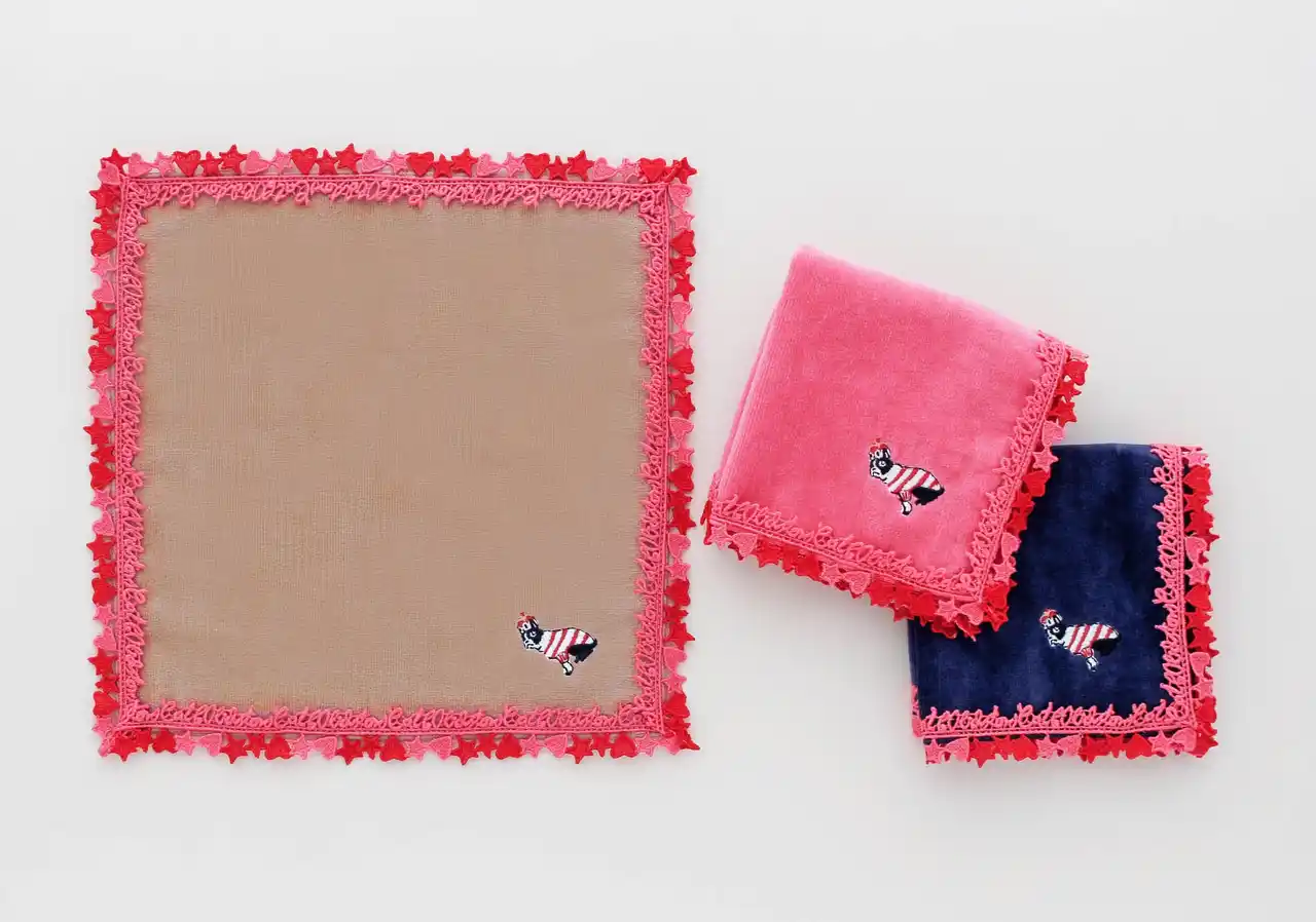 明るいピンクと赤が目を惹く、ロゴとハート&星のレースで縁取った華やかなタオルハンカチ。フレンチブルドッグの「バーニー」の刺繍がキュートなワンポイントになっています。パーティーシーズンのファッションにも合わせられる特別な一枚。 |
