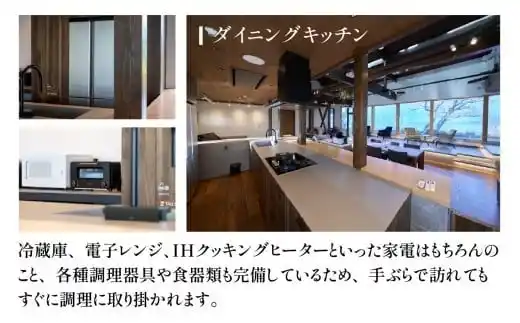 | 一歩足を踏み入れると、まずその開放感に心が奪われるでしょう。広々としたリビングは、大きな窓から差し込む陽光と越前海岸の壮大な景色が織りなす、まさに癒しの空間。ゆったりとしたソファに身を沈め、波の音に耳を傾けるだけで、日頃の疲れが溶けていくのを感じるはずです。そして、旅の醍醐味である食を存分に楽しめるのが、充実した大きなダイニングキッチンです。 冷蔵庫、電子レンジ、IHクッキングヒーターといった家電はもちろんのこと、各種調理器具や食器類も完備しているため、手ぶらで訪れてもすぐに調理に取り掛かれます。越前海岸の豊富な海の幸や、地元で採れた新鮮な野菜をその場で調理し、仲間や家族と囲む食卓は、きっと忘れられない思い出となるでしょう。穫れたての新鮮な魚介を刺身で味わったり、地元の旬の野菜を使った創作料理に挑戦したりと、食の可能性は無限大です。 | ||||||||||||