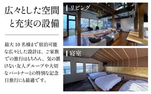 | 最大10名様(来春より最大20名予定)まで宿泊可能な広々とした設計は、ご家族での旅行はもちろん、気の置けない友人グループや大切なパートナーとの特別な記念日旅行にも最適です。 | ||||||||||||