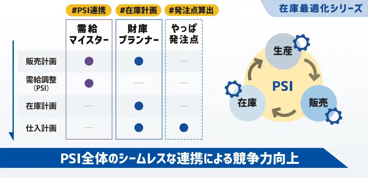 シリーズの目的は、在庫最適化のみならず、「生産・販売・在庫(PSI)」全体のシームレスな連携による、業務効率化と企業の競争力を向上させることです。 |