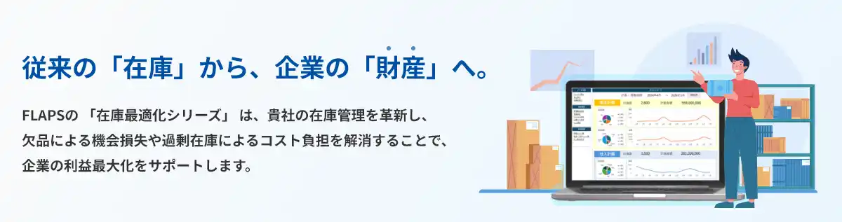 従来の在庫から、企業の財産へ。** FLAPSの「在庫最適化シリーズ」は、貴社の在庫管理を革新し、欠品による機会損失や過剰在庫によるコスト負担を解消することで、企業の利益最大化をサポートします。 |