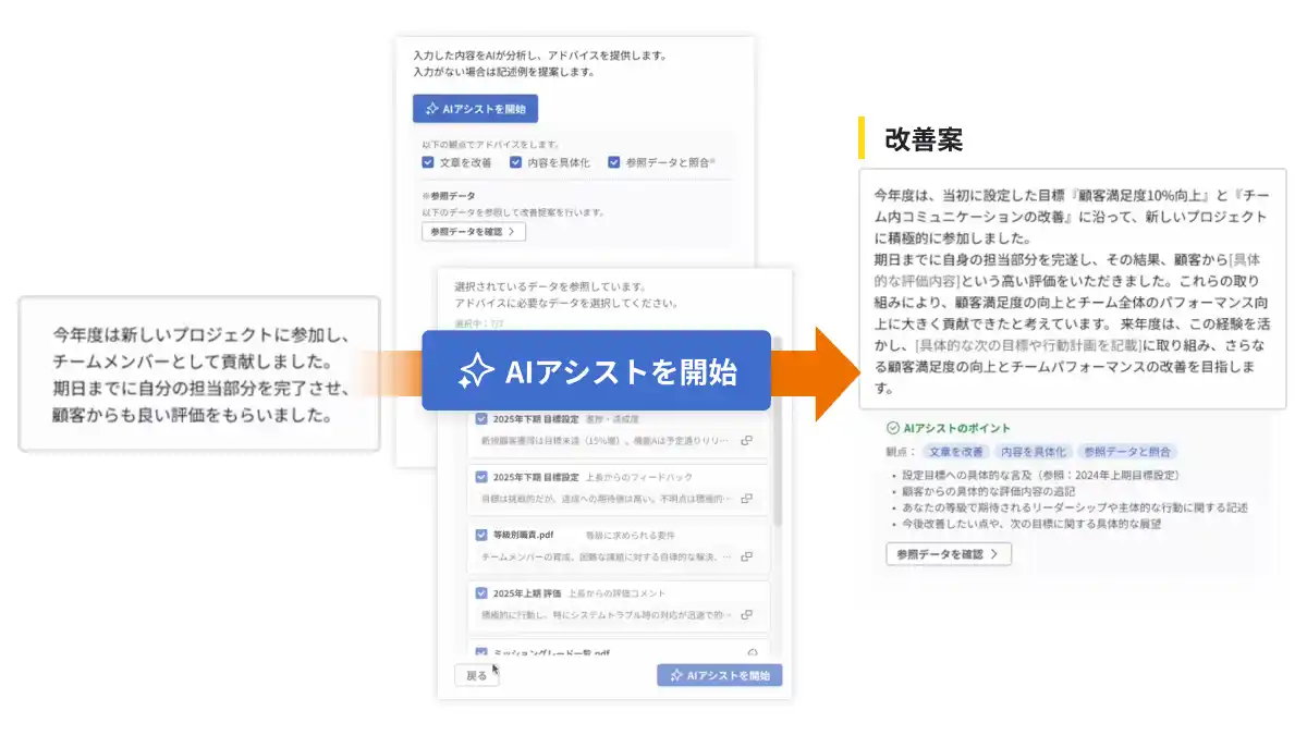 | AIにより、文章の”てにをは”や誤った記述を修正する校正機能に加え、従業員の目標設定に対して強力なアシストを図ります。 | |||