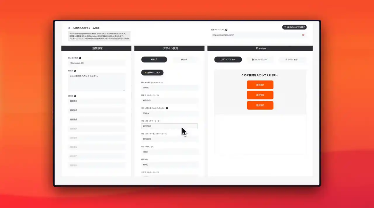 ・直感的な画面操作でHTMLを自動作成 設問文や選択肢をテキストで入力し、選択肢ボタンのカラーやサイズを選ぶだけで、メール本文に埋め込むアンケートのHTMLが自動で作成されます。直感的な操作で作成できるため、配信先に合わせてカスタマイズしたアンケートを手間なく実施できるようになります。 |