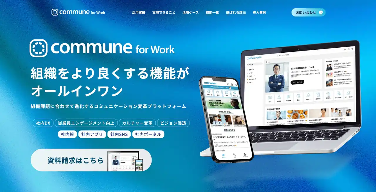 「Commune for Work」は、「社内SNS」「社内ポータル」「社内報」の機能を搭載し、組織課題に合わせて進化するAll-In-One型コミュニケーションプラットフォームです。 |