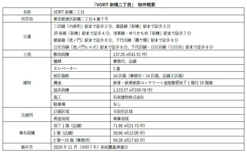 「区分所有オフィス(R)」を主軸に資産形成コンサルティングを行う株式会社ボルテックス(東京都千代田区 代表取締役社長 兼 CEO 宮沢 文彦、以下当社)は、「VORT新橋二丁目」を取得しました。 |