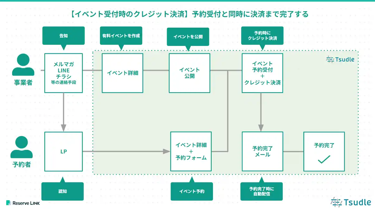 このような流れから、Tsudleは予約時にクレジットカードによる事前決済を完結できる機能を実装しました。“受付のスムーズ化”と“参加者の利便性向上”を両立する新たな仕組みを提供します。 |