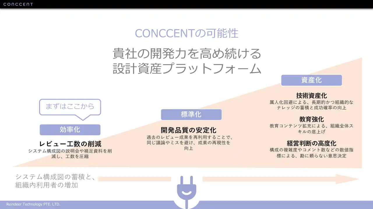 よってCONCCENTは、みなさまがシステム設計とレビューの知見を組織の財産として蓄積し、次世代の開発プロセスを支える基盤となるよう、サービスを提供してまいります |