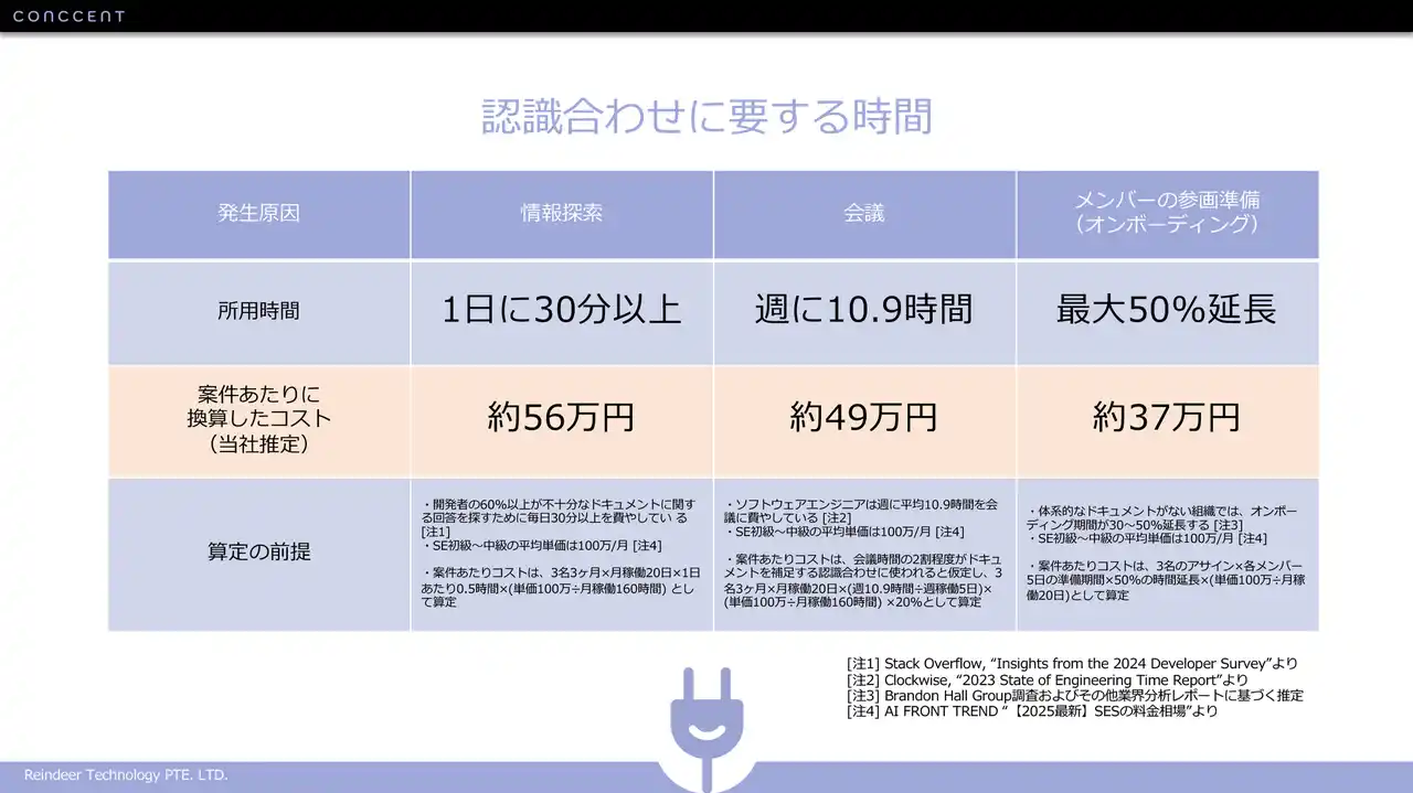 さらに Clockwise 社のレポートでは、ソフトウェアエンジニアは週に平均10.9時間を会議に費やしているとされ[注2]、体系的なドキュメントがない組織では、オンボーディング期間が30~50%延長すると推定されています[注3]。 |