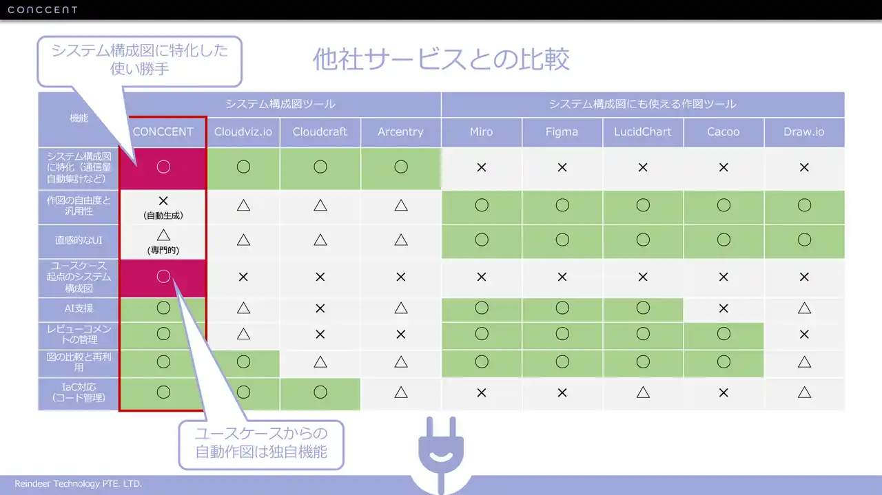 レインディア テクノロジー(英文:Reindeer Technology PTE. LTD.、本社:シンガポール、CEO:原 伸太郎、CMO:池田 祐樹、以下 レインディア)は、システム開発におけるレビュー工数の増大、認識齟齬、ドキュメント不足による手戻りを大幅に削減する、ユースケース起点のシステム構成図ツール「CONCCENT(コンセント)」を正式リリースしました。 |