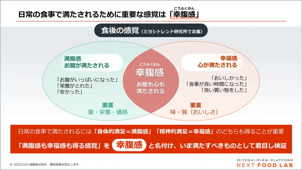 ミヨシトレンド研究所は、独自の消費者調査や購買行動データから、消費者は増加する食料支出に家計を圧迫されているなか、日常の食事を「楽しみの一つ」としていると分析。日常の食事で満たされるには、「身体的満足=満腹感」と「精神的満足=幸福感」のどちらも得ることが重要であり、満腹感も幸福感も得る感覚を「幸腹感」と名付け、2026年に注目すべき要素として着目しました。 |