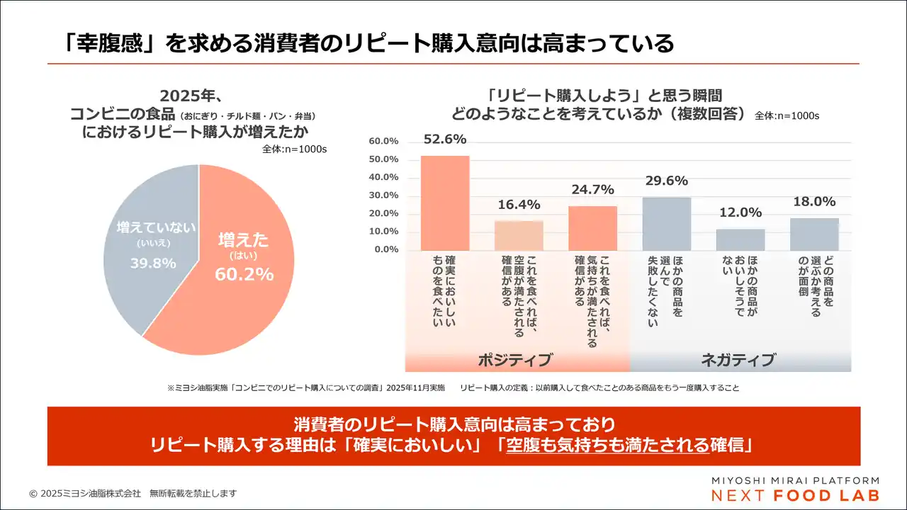さらに、消費者調査の結果から、「幸腹感」と「リピート購入(※2)」の関係に着目し検証。消費者は、再現性のある「幸腹感」を求めて「リピート購入」を増やしていることが分かりました。 |