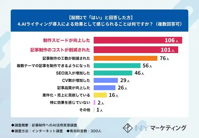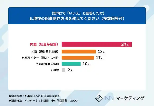 NYマーケティング株式会社(本社所在地:愛知県名古屋市中村区、代表取締役:中川 裕貴)は、集客のためにWeb記事制作を行っている全国の男女300名を対象に、記事制作へのAI活用実態調査を実施しました。