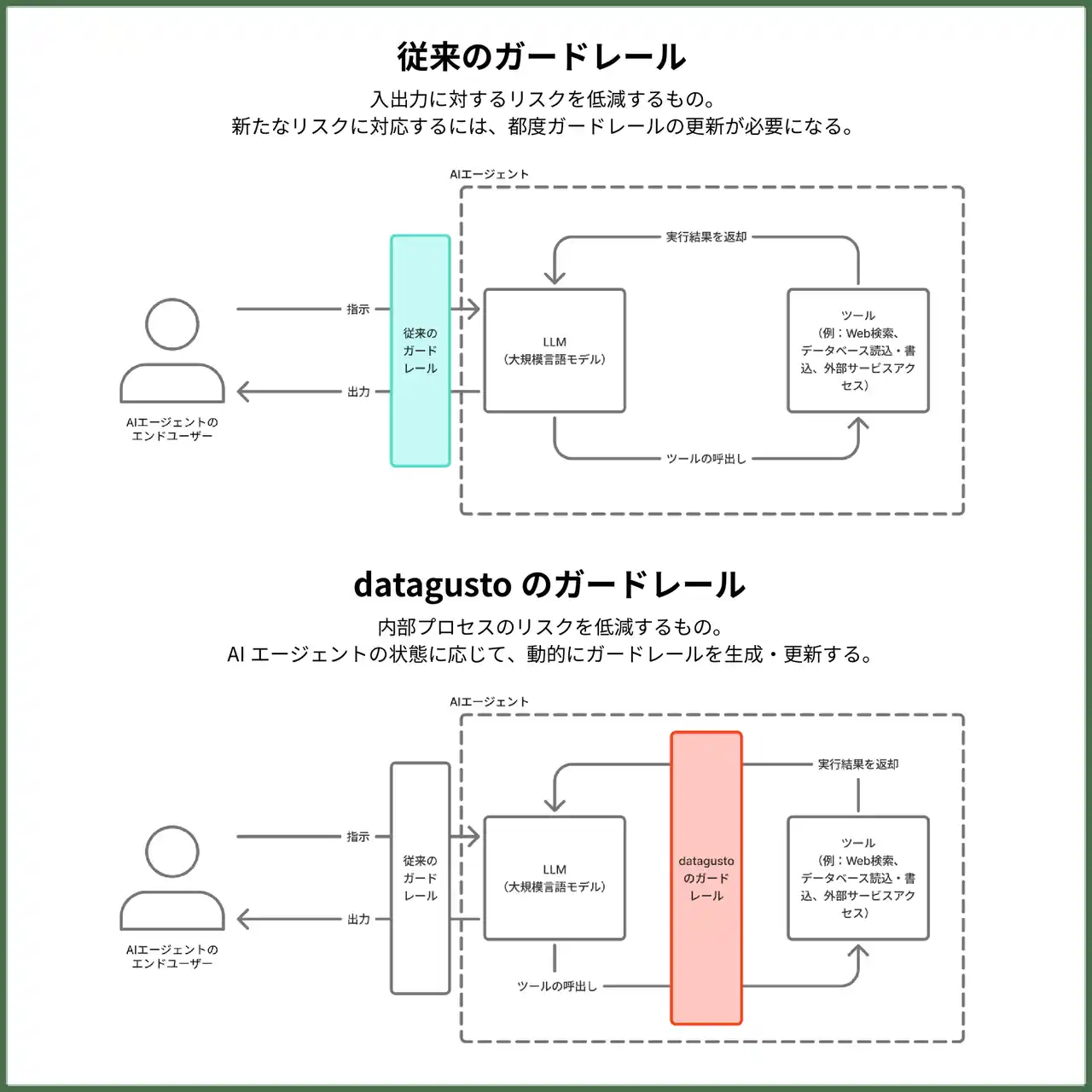 これに対してdatagustoは、AIエージェント自身の認識齟齬や誤動作といった「内部から発生するリスクの制御」(Safety)に特化しています。外部攻撃を受けていなくても発生しうる「AIのうっかりミス」や「暴走」などを防ぎ、企業のガバナンスを守ります。 |