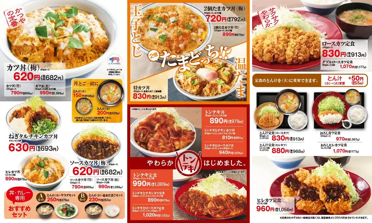 とんかつ専門店「かつや」は1998年8月、神奈川県相模原市に1号店を開店いたしました。 創業からのこだわりとして、「とんかつ」に使用している北米(カナダ・アメリカ)産の豚肉は、加工工場から店舗に到着するまで、約4週間熟成されたチルド状態で納品され、店舗で1枚ずつ丁寧に⾐付けしております。 定番メニューの「カツ丼(梅)80gロース」は620円(税込682円)。定食メニューで人気の、サクサクな⾐とやわらかなお肉を味わえる「ロースカツ定食