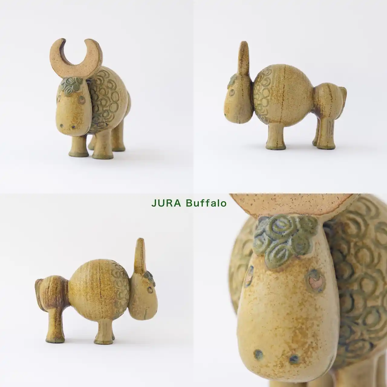 「JURA」シリーズは、6体の動物で構成されています。こちらはその中のひとつ「バッファロー」の陶器です。シャモット炻器製ならではの風合いが楽しめ、クリッとした上目遣いや丸みのあるフォルムが魅力的です。 |