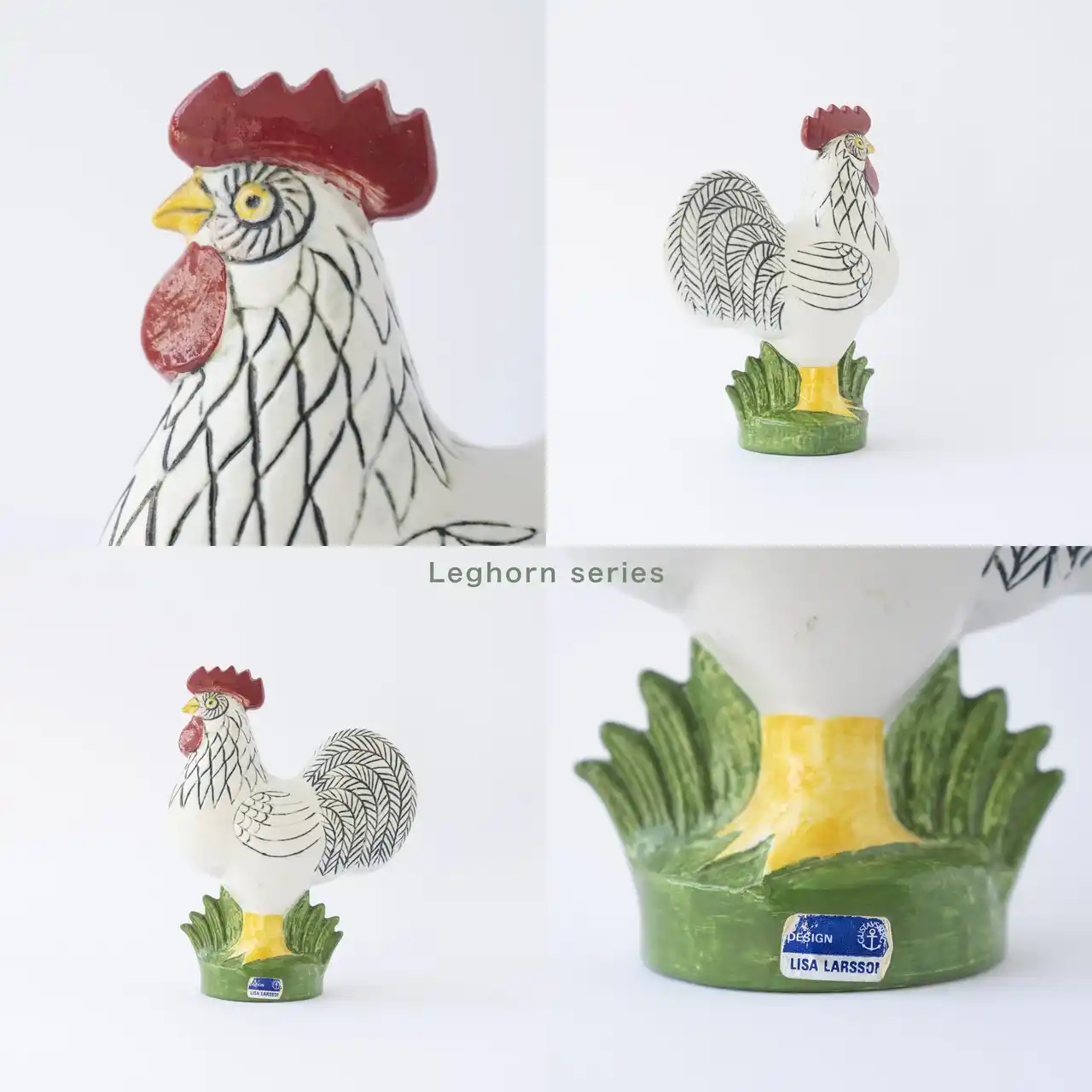 1968年にリサ・ラーソンがグスタフスベリ社のためにデザインした「Leghorn」シリーズの雄鶏です。マットな質感が特徴的な白炻器(white stoneware)で作られており、堂々とした姿が表現されています。 |