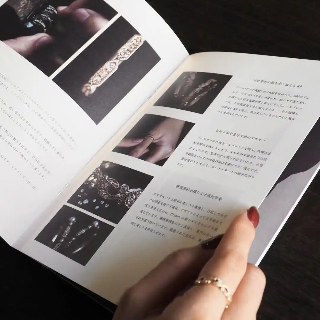 また、ミル打ちの工程解説をはじめ、K9の地金や極小のダイヤモンドなど、使用素材についても丁寧に紹介しております。ミルゴシックが持つ奥行きある世界観に触れていただける内容となっております。 |