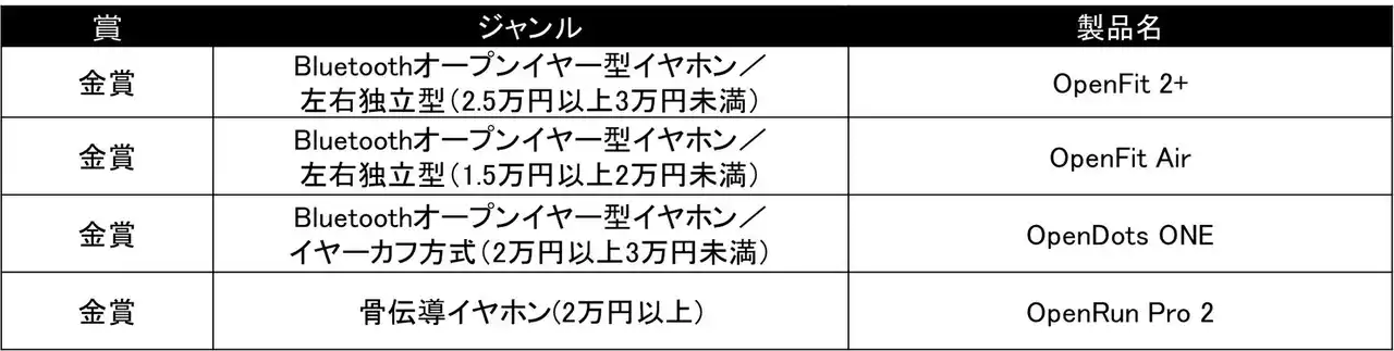 Shokz製品では、「OpenDots ONE」「OpenFit 2+」 「OpenFit Air」「OpenRun Pro 2」の4製品が金賞を受賞しました。また、その他にも16のShokzモデルが受賞し、多くのモデルが各部門で評価されました。 |