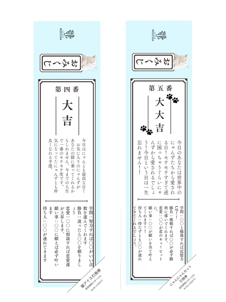 猫たちからのメッセージ付きで楽しめる、MOCHAオリジナルの“にゃんずおみくじ”も同時販売。おみくじには、その場で使える景品や次回以降に使えるクーポンなど、いずれかが必ず入っています。 |