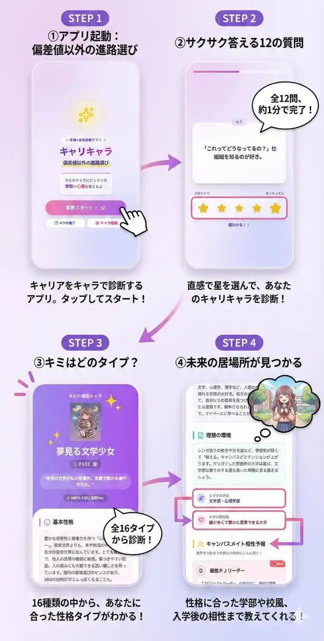 「論理的か感情的か」「単独行動かチーム重視か」など4つの軸から、ユーザーを16種類のキャラクター(例:「孤高の職人ガール」「社会を変える革命家」「癒やしの妖精さん」など)に分類。ポップなイラストと辛口かつ的確な解説で、高校生の自己分析を楽しくサポートします。 |