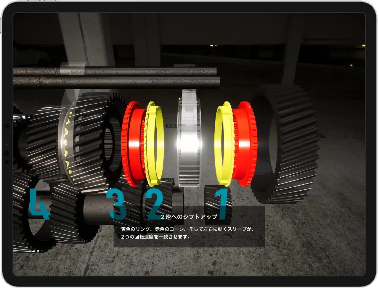 | 4ストロークサイクル、点火順序、シンクロメッシュ機構など、エンジンと変速機の基本を立体的に学べる「TechTour(テックツアー)」モードを搭載しました。エンジンモデルを実際に動かしながら、「なぜこの順序で動くのか」「なぜこの構造になっているのか」を理解できるよう設計されており、工学や自動車技術に興味を持ち始めた学生や若い世代にもおすすめです。 | ||||||||||||||||||||||||||||||