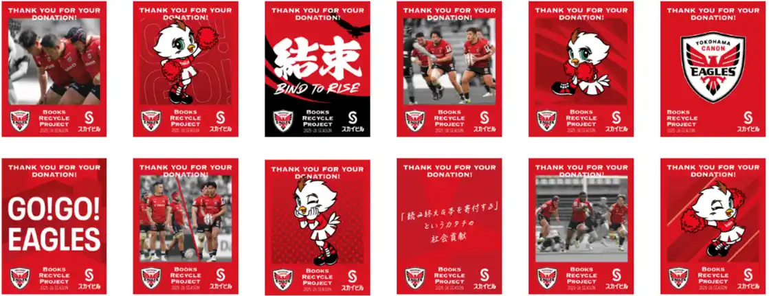 | 今シーズンは、過去2シーズンに亘りイーグルスと共同で取り組んできた、古本を回収し中古市場に再流通させるプロジェクト「ブックリサイクルプロジェクト」をさらに推進。また、イーグルスのセカンダリーホストエリアである、大分県で開催される試合観戦チケット(宿泊旅行付き)が抽選で当たる「LINEレシートキャンペーン」の実施。さらに、イーグルスを応援する気持ちがさらに高まる、試合結果に応じて配信する「LINEクーポンプレゼント」をシーズン通じて行うなど、3年目となる今シーズンは、これまで以上に結束を強め、ラグビーの魅力と横浜の魅力を広く発信し、地域社会に貢献する活動を推進してまいります。 | |||||||||