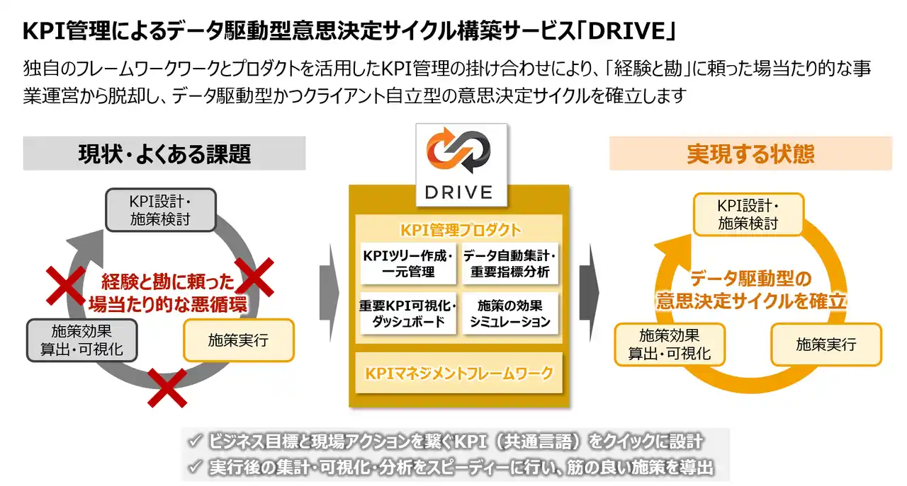 新事業創出やDXを強みに、クライアントのイノベーションや変革を支援するイグニション・ポイント株式会社(本社:東京都渋谷区、代表取締役社長:末宗喬文、以下 イグニション・ポイント)は、KPIマネジメントの導入・定着に課題を抱える企業向けに、ビジネス目標と現場アクションを繋ぐKPI設計およびデータの集計/可視化/分析/施策導出までをクイックに伴走支援する、データ駆動型意思決定サイクル構築サービス「DRIVE(ドライブ)」の提供を開始します。 |