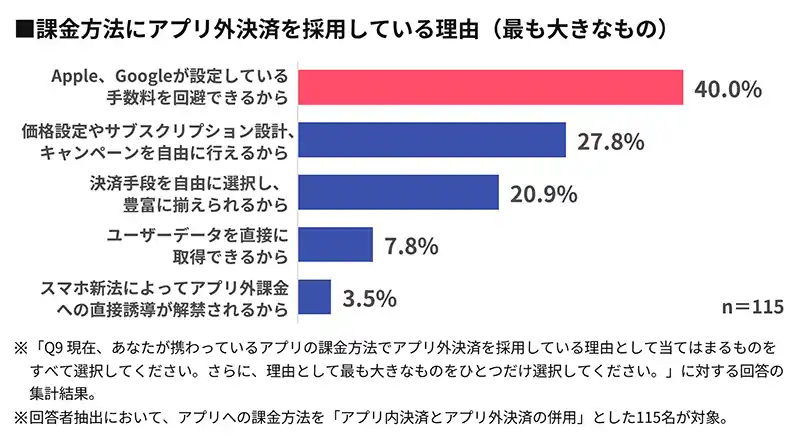 アプリ外決済を採用している最も大きな理由は「手数料を回避できるから」が40%で最多 |