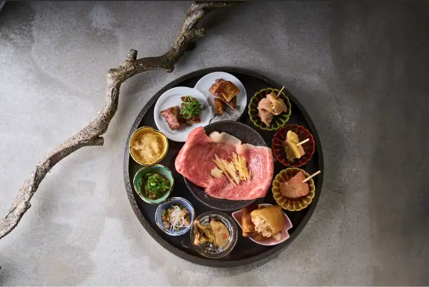 「金乃縁」を代表するメニュー。旬の食材を使用し、毎月変わるこだわりの10種の小鉢と、生のまま食べられるほど新鮮な炙り和牛肉。食べる直前に目の前であぶった新鮮な和牛は、その柔らかさから「飲むように」お召し上がれます。 |