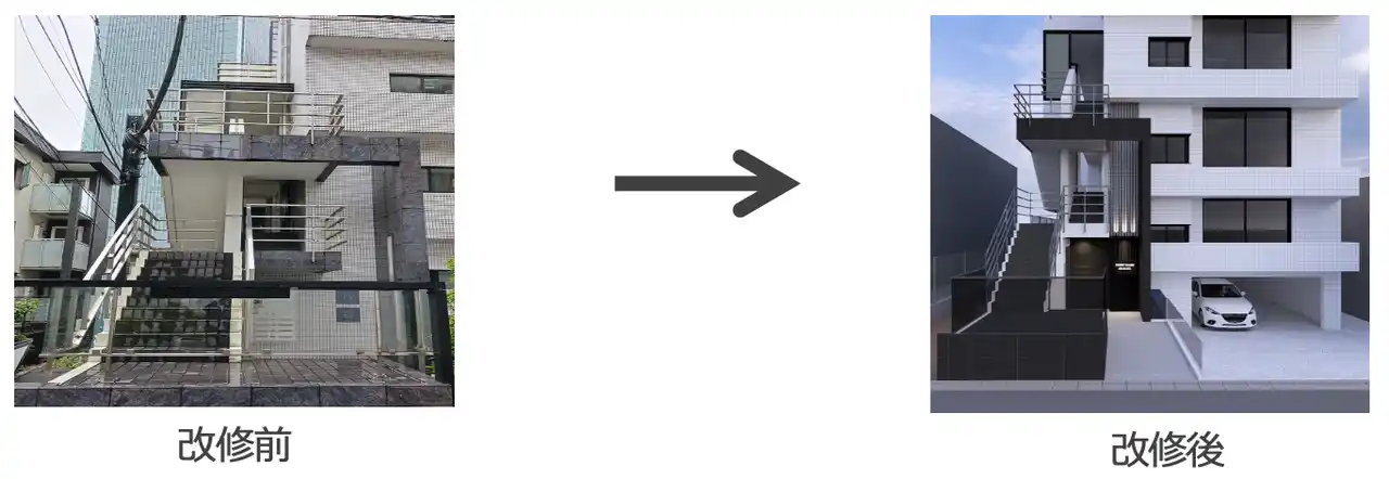 モダニズム全盛期の意匠を継承しながら、老朽化や追加素材によって失われた本来の調和と美しさを再構築。既存の大きなVoidを活かした縦方向の開放感と新設ルーバーにより、エントランスに象徴性と奥行きを創出。インターホン・郵便受けなどの既存要素は位置を変えずに素材を刷新し、建物の歴史性を尊重しつつ現代的な存在感へとアップデート。建物が本来持つポテンシャルを最大限引き出し、価値の再定義を図るリニューアル計画です。 |