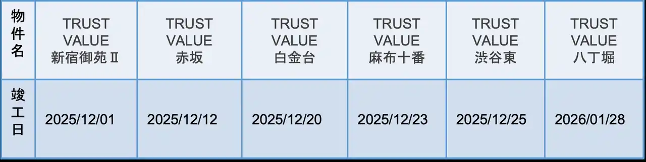 今回展開する6物件は、 「TRUST VALUE 白金台」 「TRUST VALUE 赤坂」「TRUST VALUE 新宿御苑II」「TRUST VALUE 麻布十番」「TRUST VALUE 渋谷東」「TRUST VALUE 八丁堀」で構成されており、港区、新宿区、渋谷区、中央区といった東京の中心地で、順次再生・展開を進めてまいります。 |