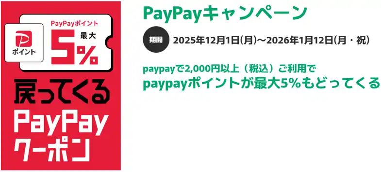 店内で合計2,000円以上(税込)をご利用の方に、PayPayポイント最大5%還元。 |
